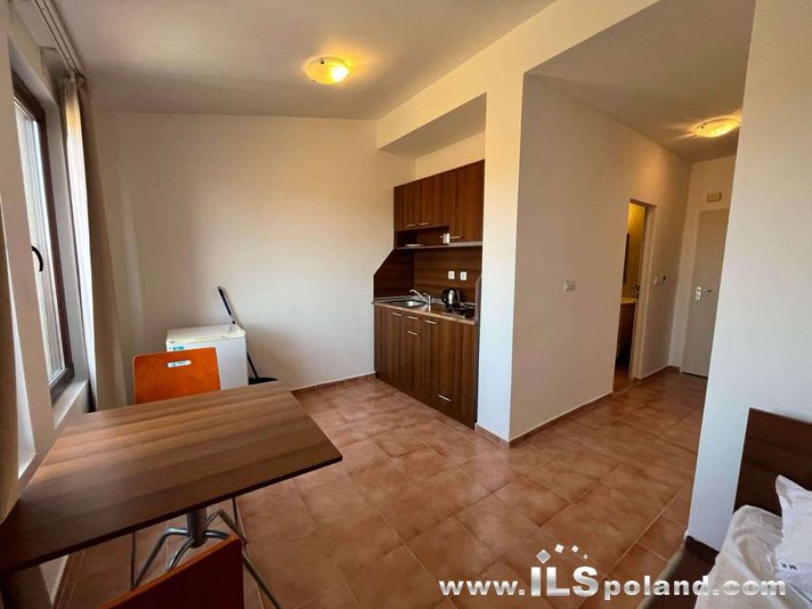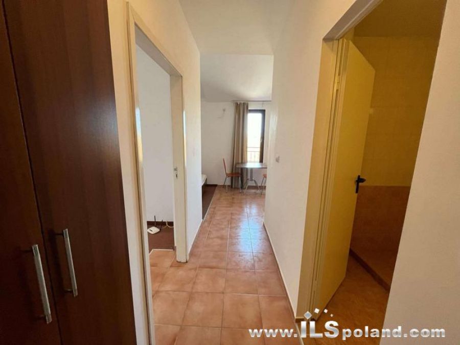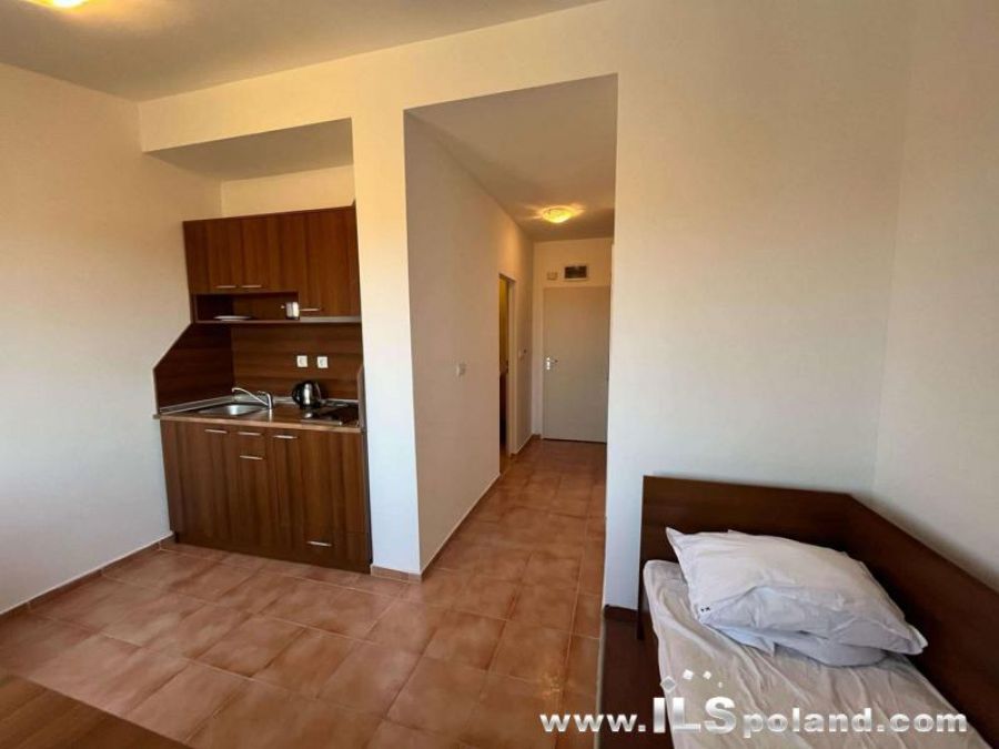 The apartment consists of a living room with a kitchenette, a hall-corridor, a bathroom with toilet and a large, covered terrace with direct exit and a view of the swimming pool, garden and neighboring buildings belonging to the complex (view from the west).